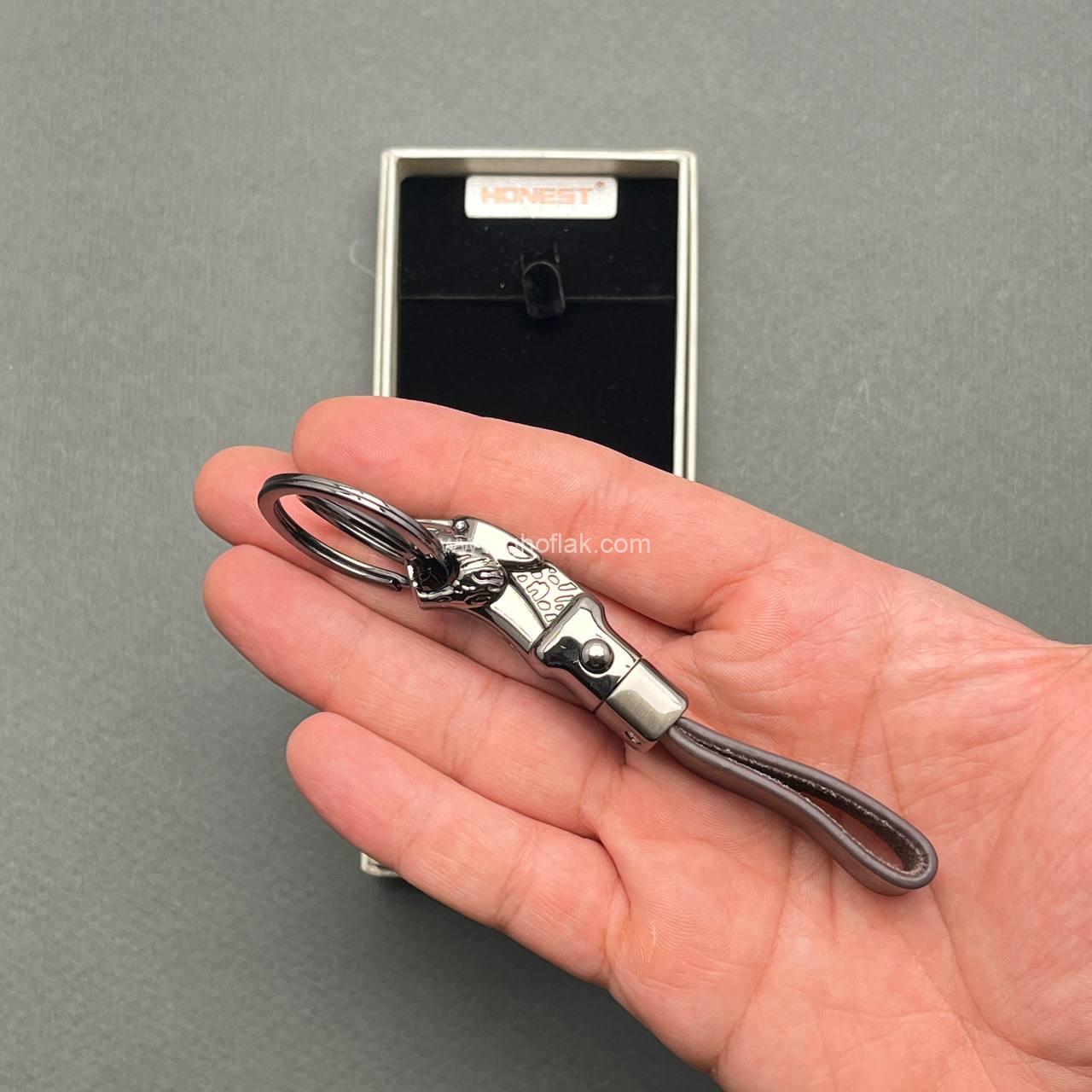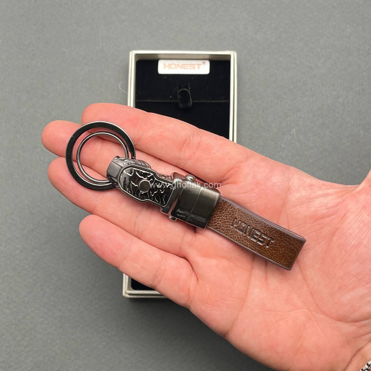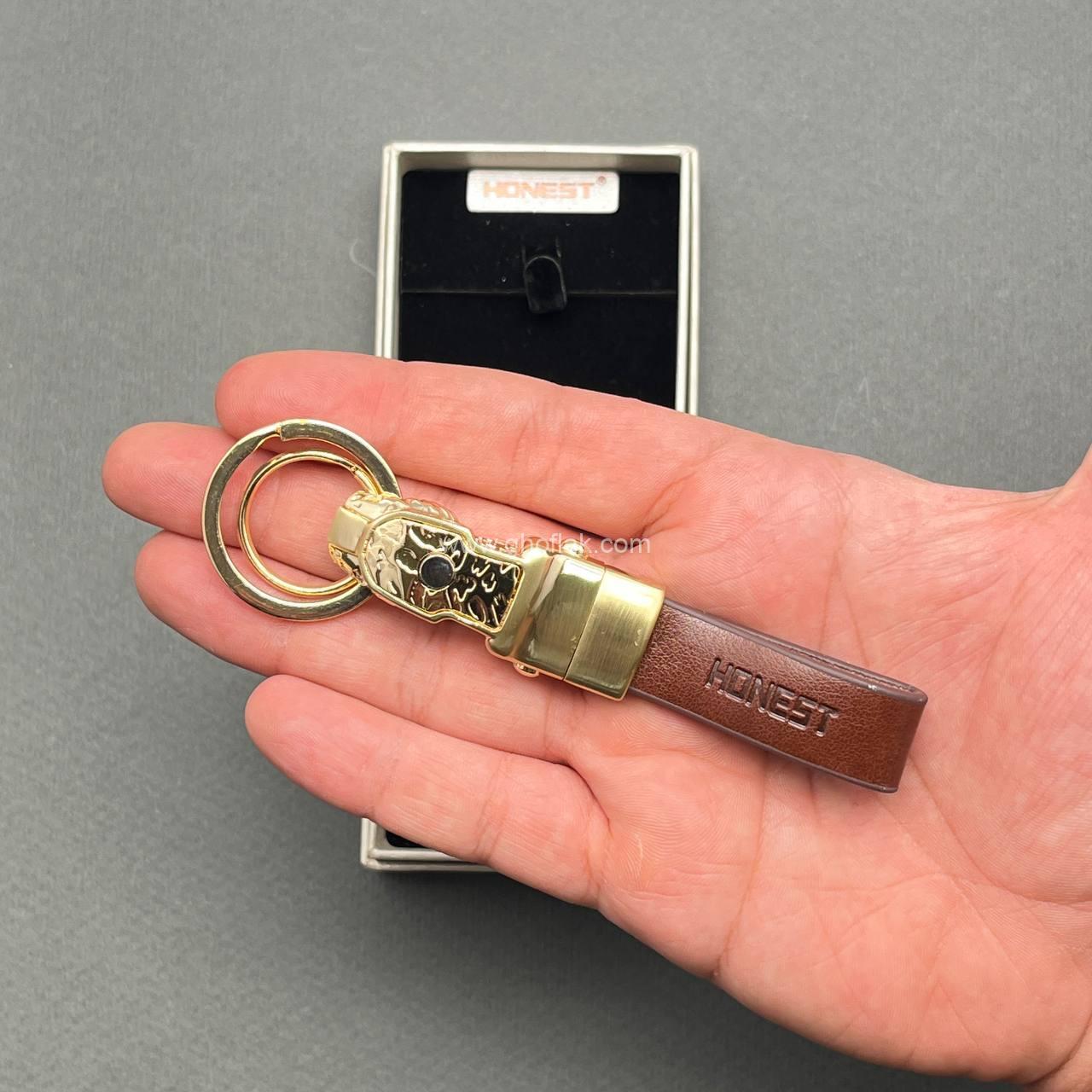 این جا کلیدی زیبا از برند معروف Honest می باشد که هم بر روی بدنه برنجی و هم بر روی بند پهن چرمی آن این برند معروف حک شده است.